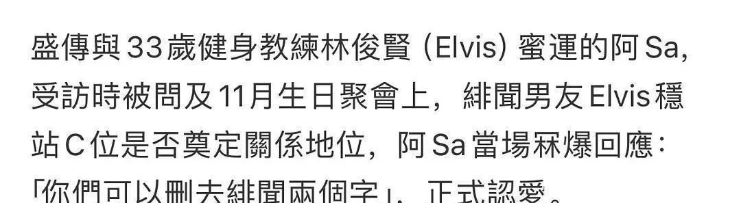 你们可以将“绯闻(男友)”这两个字省略掉。此次,阿Sa面对镜头展露出坦率的笑容,公开承认与比自己年轻十岁的健身导师林俊贤(Elvis)之间的恋情。这位曾经藏身在后备箱秘密会晤“前夫”郑中基、与“百亿麻将馆继承人”交往六年的女星,没有迎来豪门婚礼,反而牵起了33岁健身导师的手。年龄相差十岁的姐弟恋被勇敢宣布的底气,源自于43岁的阿Sa在经过二十年的情感起伏后,所做出的理智决定。她的感情历程,从隐秘婚姻、流行明星到豪门再到现如今的健身教练,可以说是香港娱乐圈女性情感独立逐步发展的缩影。